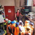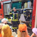Der Feuerwehrmann zeigte, wie sie bei einem Brand vorgehen. Er erklärte kindgerecht, warum es wichtig ist, ruhig zu bleiben und den Anweisungen zu folgen. Die Kinder durften auch selbst an einer kleinen Station üben, indem sie mit einer Pumpenspritze Hütchen umspritzten.